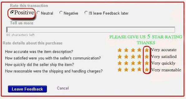 Your excellent review is very important for us,so if you are satified with our products,please give us five bling bling stars.
